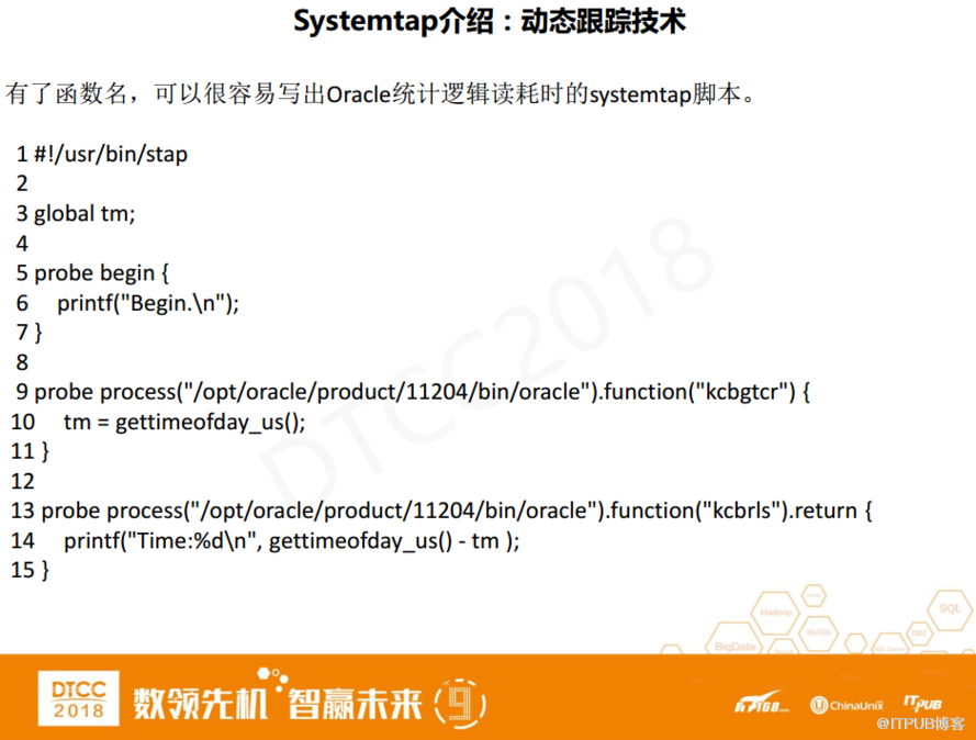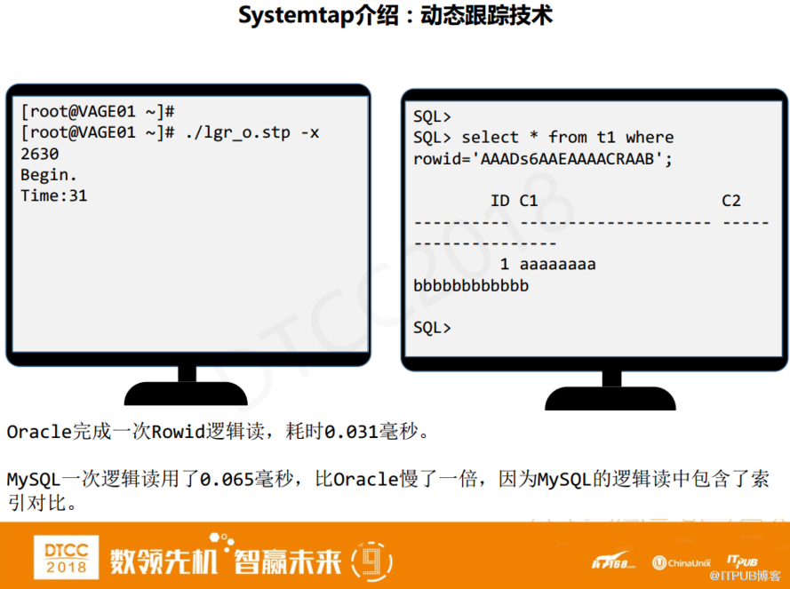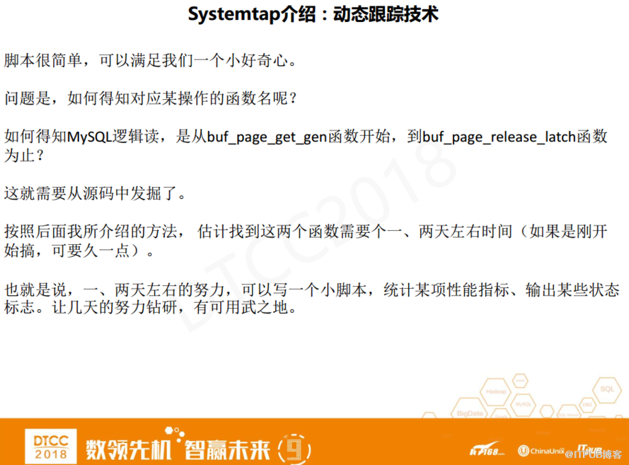 Oracle有1367个等待事件、1000多个性能资料,共计使用了3000多个指标来反映数据库的状态跟性能。相比之下,MySQL这样的开源数据库在这方面就弱了很多,但同时也给SystemTap这样的动态跟踪技术留下了很大的空间。
