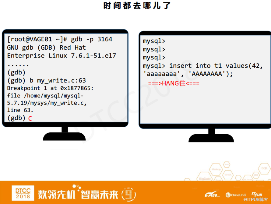 其中,3164是正在运行mysqld的进程号,执行之后会输出很多信息,当GDB运行之后,目标程序里的任何操作都需要经过GDB的批准。这时如果在MySQL里执行一条SQL语句,那么这个SQL语句会被HANG住。原因很简单,我们没有在CBD里发命令让它继续跑。