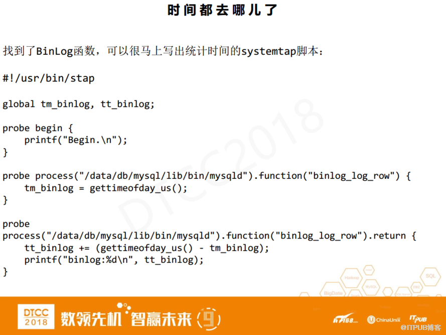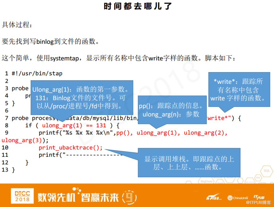 如果满足了函数名称中带有write,第一个参数是binlog文件号,那么它就极有可能是写到文件的函数。我需要具体做什么操作?首先,输出三个参数,然后我们利用SystemTap的内置函数pp,显示探针对应的信息,包括探针的函数名等等。之后,输出一个堆栈,堆栈指的是当前函数的上层,然后以此类推再继续往上找。