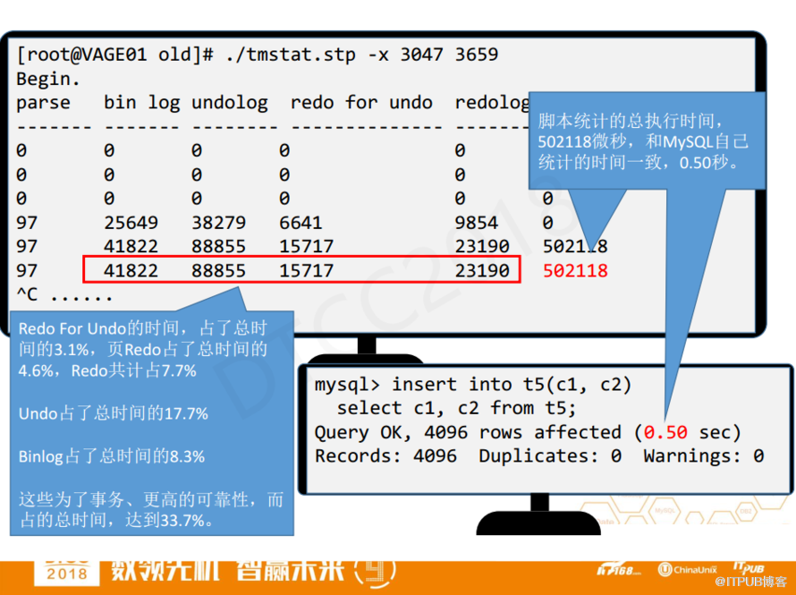 脚本统计得到的耗时是50万微秒,这和MySQL自己统计的时间0.5秒是吻合的,不过我的统计比MySQL客户端详细多了,其中包含了 redo for undo占了总时间的3.1%,页redo占了总时间的4.6%,总redo的时间占了7.7%,而undo占了17.7%,binlog占了8.3%。把这些时间相加,就是InnoDB为了事务、更高的可靠性而额外需要付出的时间,总共占到总时间的33.7%。