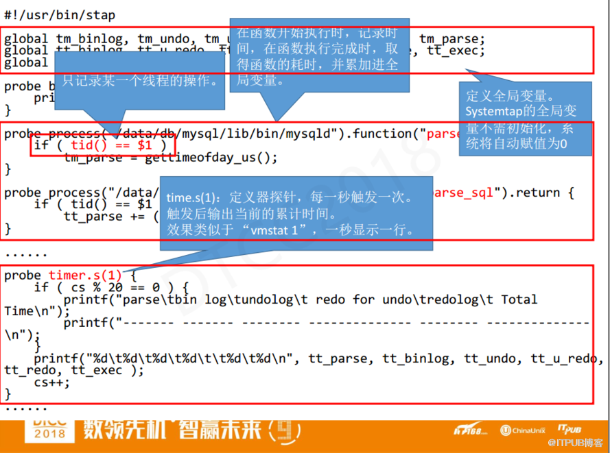 下面讲一下这个脚本的重点部分。第一个就是定义了很多的全局变量,用来跨多个探针记录时间;第二统计解析耗时,这里多了一个东西tid()==$1,其中$1是传递过来的参数——线程号,tid是SystemTap获取当前线程号的函数,考虑到跟踪的mysqld可能是多线程系统,而我们只需跟踪目标线程,所以要把其它线程都过滤掉;第三time探针,括号中的1代表一秒钟触发一次。 每次触发之后输出时间指标,这里是模拟vmstat 1,一秒显示一行。