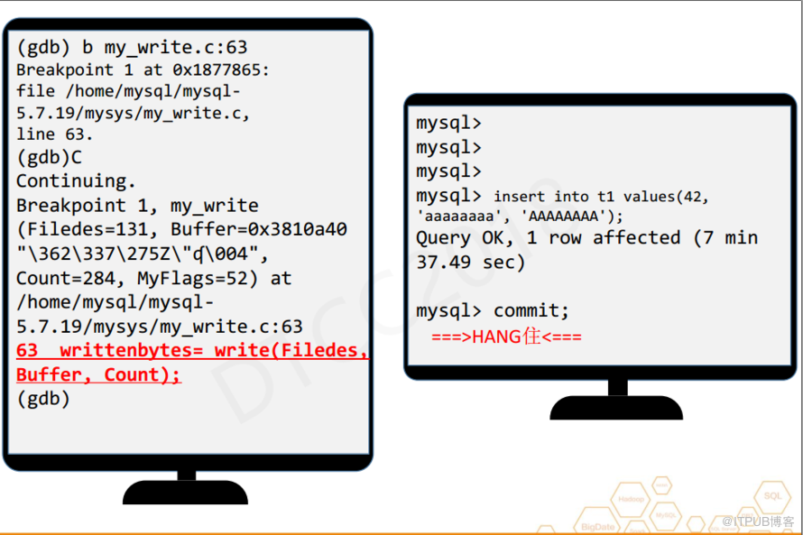 之后执行commit,再次被Hang住了,这时是断点被触发了。