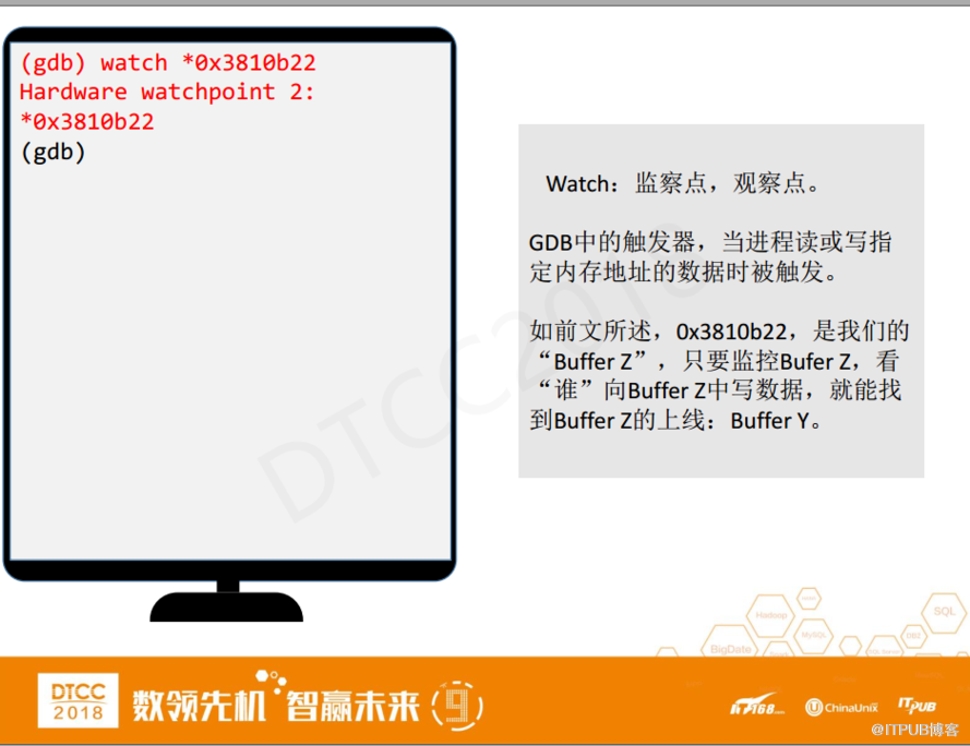 之后,用watch设置一个观察点,相当于GDB里的断点,当进程读写到指定内存时被触发。如前文所述,0x3810b22是我们找到的buffer z,设置了监察点之后,只要谁给buffer z传递数据,那么监察点就会被触发。