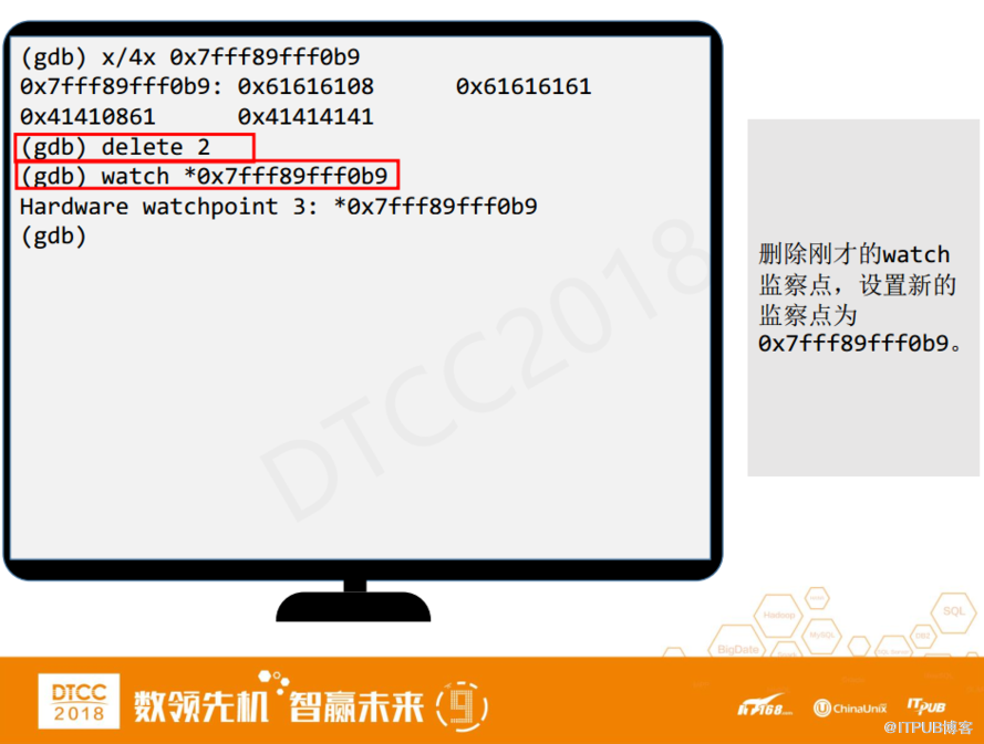 找到buffer y的准确地址之后,删除原来的观察点,在f0b9处再设置一个新的观察点。