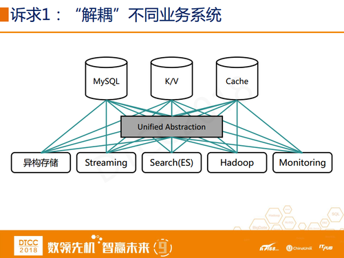 很多快速成长起来的系统都有一个共同点就是很乱,连接很乱,交互也很乱。所以,我们就在思考能不能有一个统一的抽象,把不同的业务系统或者说存储系统之间解耦。