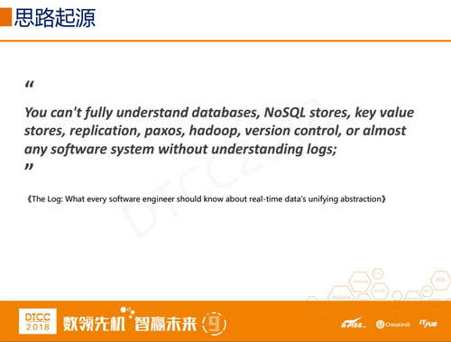 上面这两个核心的诉求,如何去满足呢?我们思路的来源,相信在座的很多同学都曾看过上图这篇博文,博文中有句话特别关键,大意是:数据库、NoSQL存储、KV存储、replication、paxos、Hadoop、版本控制等等,这些系统都有一个很本质的东西 — log。