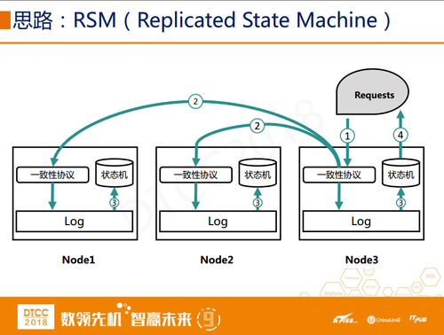 上图中有三个服务节点,某个服务节点在第一步收到请求之后,第二步是通过一致性协议模块,在不同的服务节点之间达成共识并将请求以log的方式持久化到存储介质中,第三步是把log回放到状态机中,最后一步回复给客户端(请求发起端)。