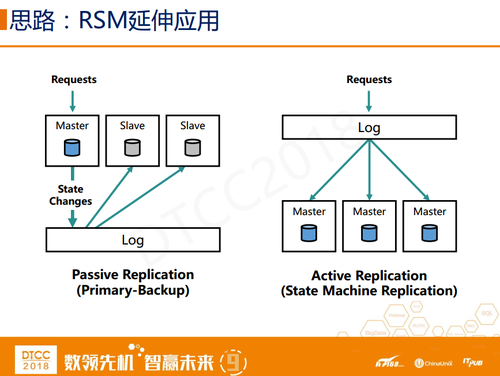 RSM本身是一个简单抽象的概念,所以我们具体延伸一下。RSM第一种延伸应用如上图所示,共有三个节点,我们把它认为是服务节点,下面有统一的log抽象。假设客户端发起请求到master节点,master节点执行请求通常会产生log,log代表的是这次请求对存储系统状态带来的变化,存到统一log中再通过其它手段回放到不同的Slave中去。这就是典型的passive replication。