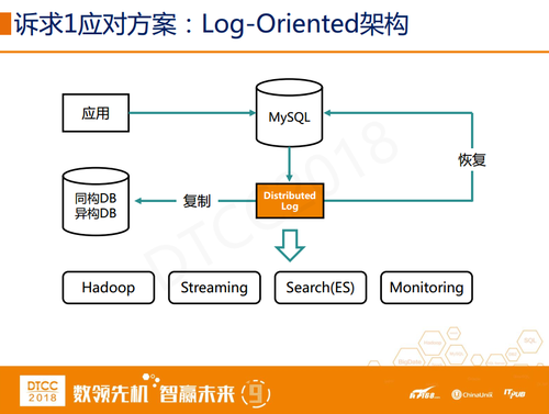 解决第一个诉求比较简单的方式就是面向log的架构设计。国外有很多人提出了这个概念,但是在国内还比较小众,如果我们所有东西都基于log,那么我们可以做很多东西。如应用到DB中,无论是MySQL binlog还是InnoDB redolog,将其存储到统一的log集群中,这个log可以用来做什么呢?第一是做异构DB的复制,有了redolog之后,就可以回放到其它DB中,例如Redis、PostgreSQL等等。做数据库备份恢复的时候,有了统一的log之后可以通过位点去追binlog。数仓、离线处理、Hadoop、实时流计算、Flink、Spark、ES或者是实时监控都可以基于log来做数据同步和消费。