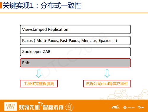 有了统一的架构抽象以后,这里面还涉及到几个问题,第一个是分布式系统当中的一致性问题,这是做存储或者分布式系统当中比较经典的问题了。我按照一致性协议的时间先后排了一下序,从最早的Viewstamped Replication到后面的Paxos,其中 Paxos又有非常多的变种,multi-Paxos,Fast-Paxos,Mencius、Epaxos,接下来是Zookeeper里的ZAB协议,最后是Raft算法。