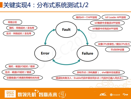 讲到测试,那么就有三个概念是绕不过的,fault、failure和error,它们三者之间其实是有某种比较复杂的关系,比如说硬件出错了会导致系统软件层面的报错,报错之后,用户调用时会得到error。所以,在分布式系统中做测试要考虑各方面的原因,例如:随机去kill掉分布式系统中的一个节点,那么这个节点可能是leader,也可能是follower节点。某些测试用例需要kill集群中多数派的节点,甚至是所有节点全部干点等等,我们需要去构建各种各样的情景。