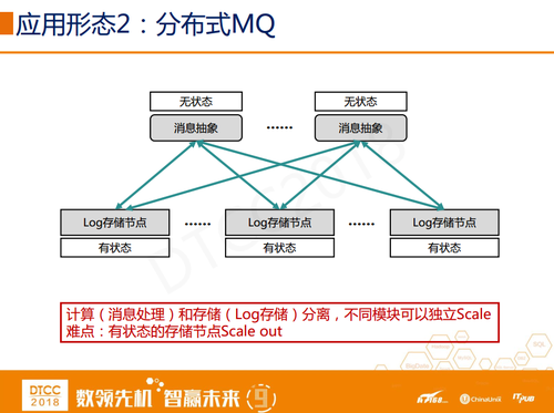第二,基于分布式log系统实现MQ。它采取的思路还是比较容易理解的,上面的消息和下面的存储分离开来,相当于是一种计算和存储相分离的架构。不同的是,上面的消息处理节点是无状态的,下面的log存储节点是有状态的。