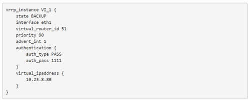 配置备机/etc/keepalived/keepalived.conf,与主机类似,但是state是backup,且权重较低即可: