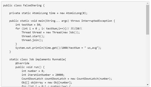 为了避免Java JIT(这也是一层抽象)的影响,我们每次执行都要加参数-Xint来强制使用解释模式。在我的机器上(4core,8processor,Core-i7),直接运行这段代码得到结果1是4594 us,avg这个级别,在结果1基础上把//*****一行取消注释得到结果2是3916 us,avg 这个级别,在结果1基础上运行参数加上-XX:-RestrictContended使得@Contended起作用就能得到结果3是3466 us,avg。