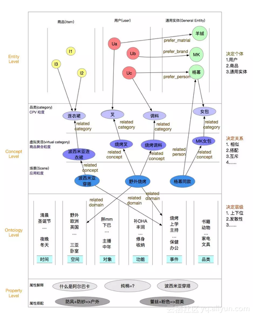 从数据层面上来看,我们要描述一个事物(entity),首先需要把它定义为一种类别(instance-of-class)的实例,这种类别通常又可以通过一个概念(concept)来表示,不同的概念会有自己不同的属性(proeprty),一类概念的具有的属性集合可以称为概念的schema,有同一类schema的概念一般会属于不同的领域(domain),领域内有自己的语义本体(ontoloty),通过本体的层次(比如“英国"-is-part-of-”英国"),我们可以形式化概念的层级和表示。 那么由细到粗的,我们定义了一套电商概念体系的表示方法,通过不断细化ontology和concept,以及他们之间的关系,来关联起用户和商品,甚至外部的实体。
