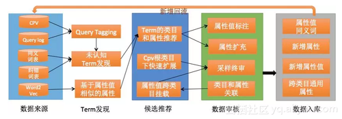 短语挖掘:商品图谱端我们需要的是做更多的商品属性认知,我们知道,完善的cpv体系的前提是phrase的认知,针对此我们建立了一个bootstrap框架下的cpv挖掘闭环,目标是能够长期有效积累cpv数据,扩大query和商品的认知(这也是商品打标的数据来源之一)。
