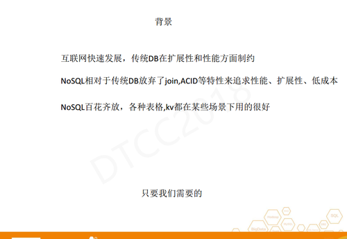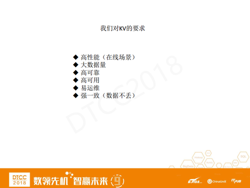 第五是易运维,系统实现的复杂一点,运维能够更方便;最后是强一致,无论集群怎么挂或者切换,数据都保证不丢失。