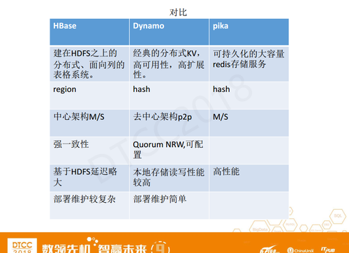 HBase数据分片方式是有顺序的region,Dynamo用的是Hash。HBase是中心架构,中间有主从,而Dynamo是去中心架构p2p,其应用的很多技术都有借鉴意义,例如集群管理、信息发现、向量时钟等等。Pika更像是一个单机Redis,主从、集群都需要自己做。