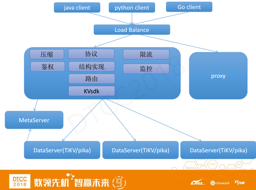 底层架构是一个中心化的架构,MetaServer存集群的元信息,会来处理一些心跳上报、集群管理命令等等。对于DataServer如果是要求强一致就使用TiKV,如果是要求低成本就使用Pika。