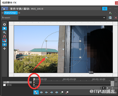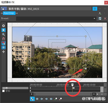如果想要裁剪视频画面,右键点击素材,选择“视频事件平移/裁切”,出现如图二对话框。然后把关键帧拖到开头,然后拖动画面的四个角缩放即可。也是非常方便。