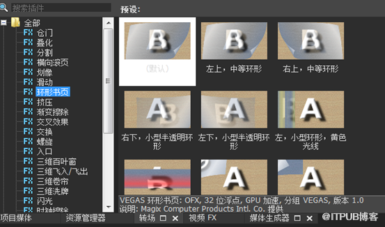 图 4 所示为 Vegas 的环形书页转场,在 Vegas. 中,有近 300 种转场特效,从寻常的叠化、分割、滑动,到酷炫的入口、三维卷帘、环形书页,全都包含在内,鼠标左键拖拽至视频轨道就能完成调用。