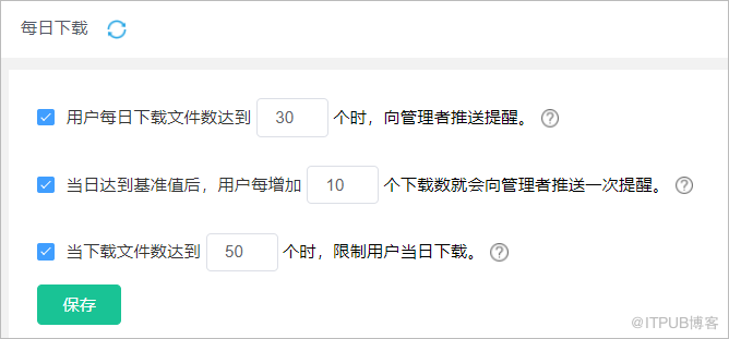 例如按照下图的设定,当人员当天下载了30个文件,系统会提醒管理员,员工再下载10个,又再向管理者推送提醒,当下载量到达50个时,该人员无法再下载文件了。