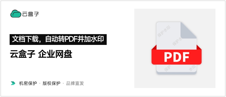 最后,云盒子企业网盘文件下载自动转PDF并添加水印,集中应用于文档安全、版权保护以及品牌宣传等场景,例如政府的公文保密、公司商务合同安全、出版社电子书保护、知识产权版权交易、企业内部机密资料保护、企业外发资料品牌宣传等。如果你想测试云盒子企业网盘文件下载自动转PDF并加水印的功能,欢迎进入云盒子官网!
