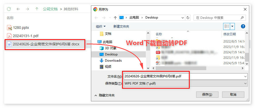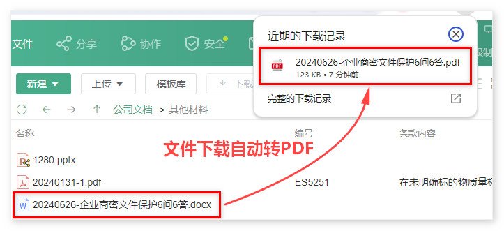 当管理员设置了【 下载水印 & 点阵水印】,用户在企业网盘中下载Word 文档,此时也会自动转成PDF。