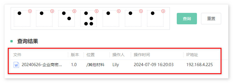 在水印溯源界面,选择文件中连续的点阵图形进行查询,可以查询到文件名、所属目录、操作人、操作时间等信息。