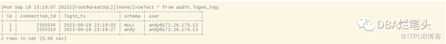 (Mon Sep 18 23:19:07 2023)[root@GreatSQL][(none)]>select * from audit.logon_log; +----+---------------+---------------------+--------+--------------------+ | id | connection_id | login_ts | schema | user | +----+---------------+---------------------+--------+--------------------+ | 1 | 2505034 | 2023-09-18 23:19:02 | NULL | andy@172.26.170.13 | | 2 | 2505310 | 2023-09-18 23:19:27 | andy | andy@172.26.170.13 | +----+---------------+---------------------+--------+--------------------+ 2 rows in set (0.00 sec)