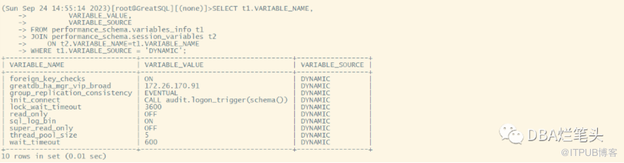 SELECT t1.VARIABLE_NAME, VARIABLE_VALUE, VARIABLE_SOURCE FROM performance_schema.variables_info t1 JOIN performance_schema.session_variables t2 ON t2.VARIABLE_NAME=t1.VARIABLE_NAME WHERE t1.VARIABLE_SOURCE = 'DYNAMIC';