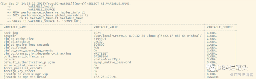 SELECT t1.VARIABLE_NAME, VARIABLE_VALUE, VARIABLE_SOURCE FROM performance_schema.variables_info t1 JOIN performance_schema.global_variables t2 ON t2.VARIABLE_NAME=t1.VARIABLE_NAME WHERE t1.VARIABLE_SOURCE != 'COMPILED';
