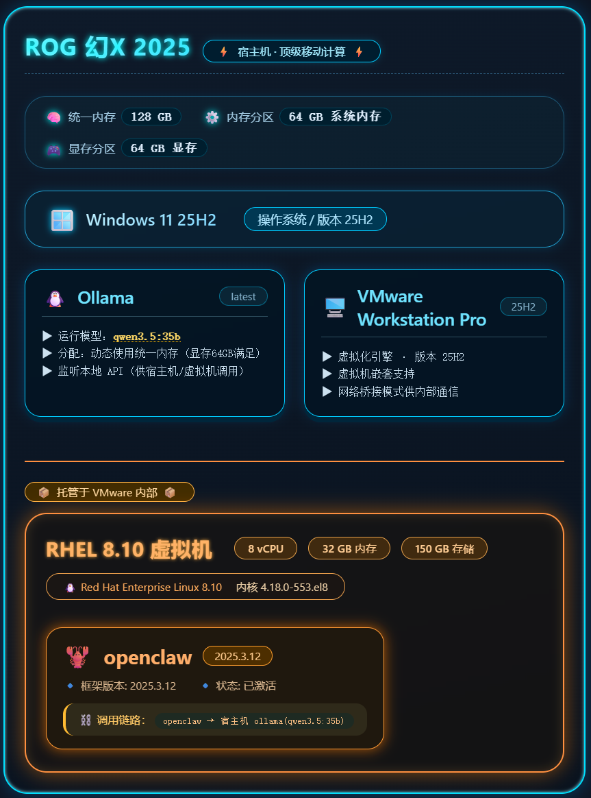 本次部署还是在我的幻X 2025(128GB)分别使用了Ollama运行LLM,OpenClaw在VMware WorkstationPro运行的虚拟机上进行部署,为了直观的展示部署架构,我分别使用豆包和DeepSeek生成了两张示意图。