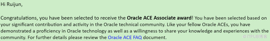分享了近一年的博客,得到了官方的认可,是件很开心的事,回想自己从想成为ACE、计划成为ACE、申请ACE,到如今进入Oracle视野,成为一名Oracle ACE Associate,也是一段蛮有意思的经历。