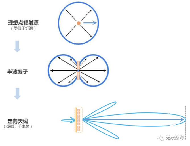 就这样增加振子让电磁波在水平方向传得更远,再增加反射板控制方向,经过这么两下折腾,定向天线的雏形诞生,电磁波的发射方向变成了下图这样。