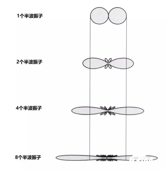 那么怎样拍扁呢?答案就是增加半波振子的数量。多个振子的发射在中心汇聚起来,边缘的能量的到了削弱,就实现了拍扁辐射方向,集中水平方向能量的目的。