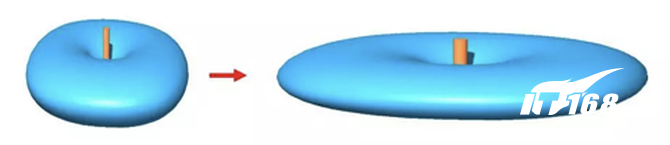 根据能量守恒原理,能量既不会增加也不会减少,如果要提高水平方向的发射能量,就要削弱垂直方向的能量。因此就只有把标准半波阵子的能量辐射方向图拍扁了,如下图所示。
