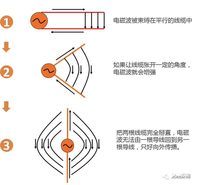 那么,天线是怎样把这些电磁波发送出去的呢?看完下图就明白了。