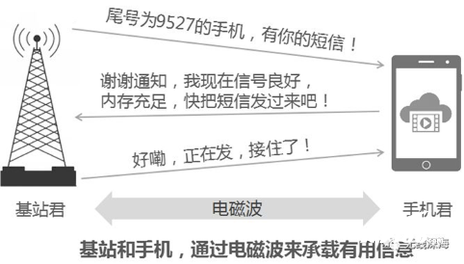 与此类似,在人类世界里,无线通信也是通过天线来传递信息的,只不过传递的是承载着有用信息的电磁波。下图就是手机和基站之间相互通信的一个示例。