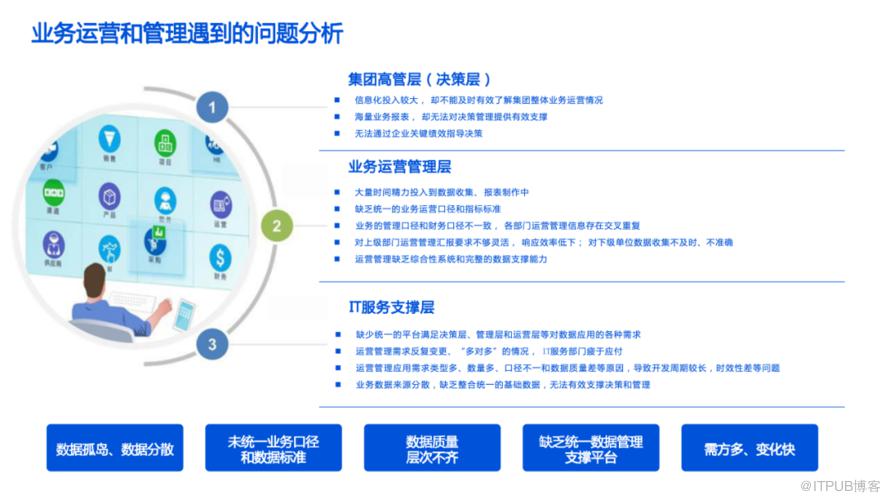 4、业务运营和管理效率低:未统一业务口径和数据标准,数据质量层次不齐,缺乏有效的数据管理和支撑平台,导致运营管理效率低下。