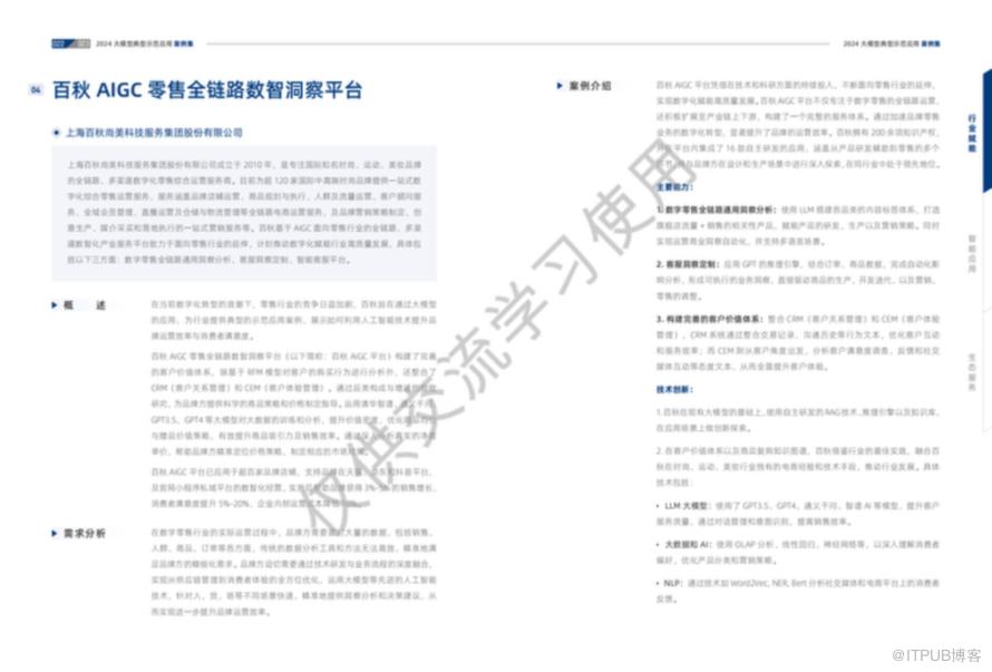 百秋AIGC零售全链路数智洞察平台利用大模型技术,为零售行业提供全链路的数字化服务,包括客户行为分析、商品策略指导等,帮助品牌实现销售增长和运营成本降低。百秋AIGC零售全链路数智洞察平台的特别之处在于以下几个方面:1、全链路数字化服务:该平台为零售行业提供从品牌店铺运营、商品规划与执行、人群及流量运营到客户顾问服务、全域会员管理、直播运营及仓储与物流管理等全链路的数字化综合运营服务。2、多渠道整合:平台支持品牌在天猫、京东、抖音等主流电商平台以及官网小程序等私域平台的数智化经营,实现多渠道数据整合和分析。3、大模型技术应用:利用清华智谱、通义千问、GPT3.5、GPT4等大模型技术,对大数据进行训练和分析,提升价值密度,优化商品均价与赠品价值策略。4、客户价值体系:平台整合了CRM(客户关系管理)和CEM(客户体验管理),通过RFM模型对客户购买行为进行分析,并提供科学的商品策略和价格制定指导。5、智能化运营:通过深入分析真实的净客单价,帮助品牌方精准定位价格策略,制定相应的市场对策,实现运营商业洞察自动化。6、效益提升:实施后帮助品牌获得3%-5%的销售增长,消费者满意度提升5%-20%,企业内部运营成本降低10%。7、技术创新:百秋在现有大模型的基础上,使用自主研发的RAG技术、推理引擎以及知识库,在应用场景上做创新探索,推动行业发展。8、经济效益与社会效益:通过实施本方案,品牌方在行业退款率普遍上涨的情况下,实现了销售增长和成本降低,同时提升了消费者满意度和内部运营效率。