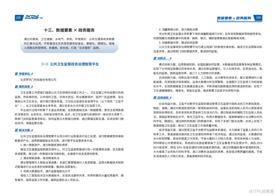 政务服务领域,数据要素的应用正在提升政府服务的智能化和精准化。例如,公共卫生监督政务治理智慧平台通过整合各类政务数据,推进政务服务标准化、便捷化、精细化,增强人民群众的获得感、幸福感、安全感。详细多个案例可以查看如下文件《北京市政务服务和数据管理局2024北京数据要素x典型案例)》