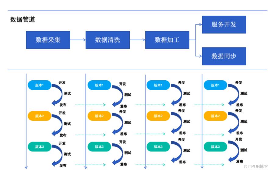 另外按照研发流程需要支持数据采集可以进行单元测试,数据清洗可以进行单元测试,数据加工可以进行单元测试,服务开发可以进行单元测试,也可以进行从数据采集到服务开发整个数据管道的集成测试,集成测试完成之后,进行一体发布,完成整个数据管道的发布。