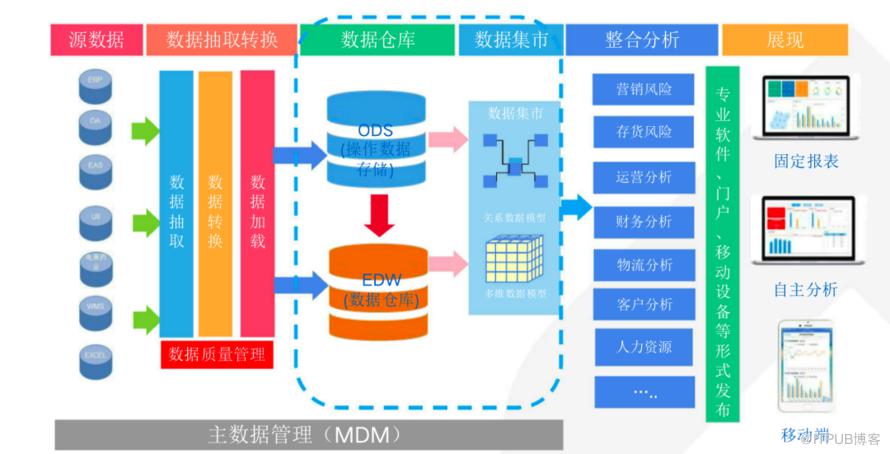 数据仓库主要包含ODS、EDW、数据集市的数据,主数据管理独立于数据仓库单独存储,在一个组织中,主数据可以被许多系统和应用程序使用和维护,包括数据仓库、ERP系统、CRM系统等。主数据管理的目标是确保主数据的一致性、准确性和可靠性,在不同的系统和应用程序中保持一致的主数据视图。因此,主数据管理通常涉及到数据整合、数据质量管理、数据同步和数据访问控制等方面的工作。
