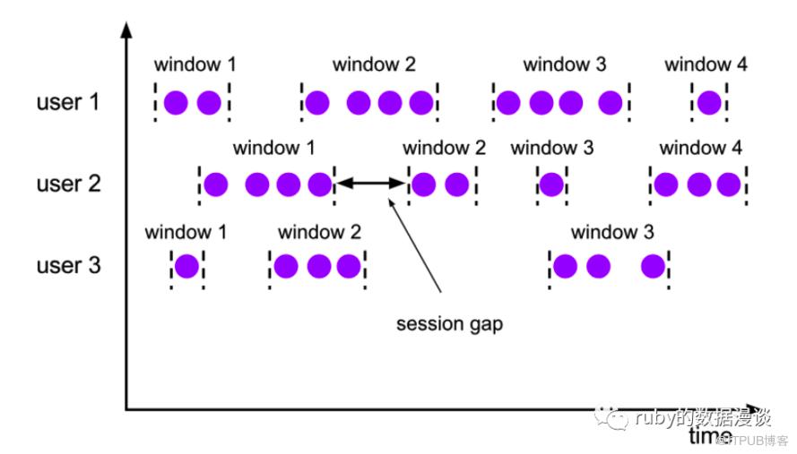 会话时间窗口主要使用窗口分配器通过会话活动来对元素进行分组,会话窗口跟滚动窗口和滑动窗口相比,不会有重叠和固定的开始时间和结束时间的情况,相反,当它在一个固定的时间周期内不再收到元素,即非活动间隔产生,那个这个窗口就会关闭。