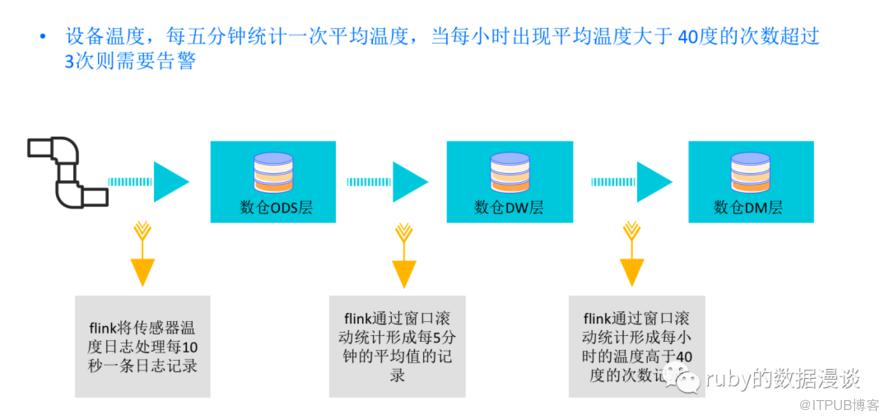 例如设备的温度传感器每10秒钟检查一下管道的温度,将温度打印日志,日志采集之后存储到kafka 中,flink 消费日志,将检测的设备温度处理成规范的数据存储到ODS的层,ODS将新增数据抛出到kafka,flink 统计每五分钟的温度的平均值,那如果需要统计平均值,则在每五分钟的开始需要记录第一个温度值,以及次数,然后将温度累加,次数累计,到五分钟结束的时候,用温度总和除以次数总和求的每五分钟的平均值,这里温度累加,次数累加即是状态,状态包含(温度、次数),每一次的状态累加。求的的每五分钟的平均温度写入DW层。然后,DW层的数据将变化写入kafka,然后flink监控到数据后,将每五分钟的平均温度是否超过40度进行判断,同时使用状态缓存,状态大于40度,则累加1,不大于40度,则累加0,然后,统计窗口计为1小时,这样得到每小时的中温度超过40度的次数,写入到DM层记录,在DM层的上的应用,通过判断当前的次数即可马上知道是否需要告警。这也是窗口API和状态一起完成的一种应用场景。