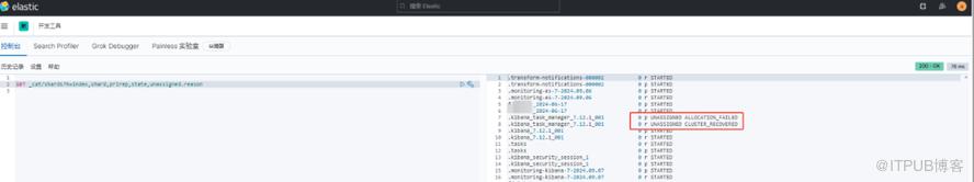 # 首先查询 Elasticsearch 中未分配的分片有哪些,可登录kibana,在开发工具里去执行如下命令: