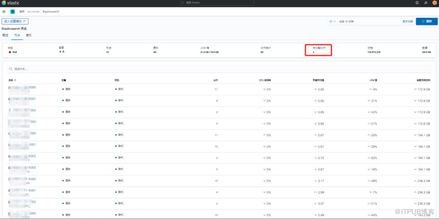 集群重新启动后,发现状态显示有两个未分配分片,如下图所示。原因可能与新增节点的角色配置不当或数据节点的分片分配逻辑不匹配有关。需要进一步排查未分配分片的问题,检查分片的分配策略和副本设置。