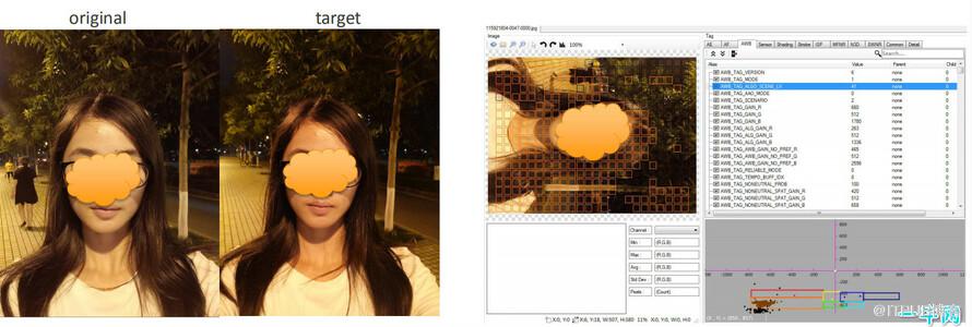 分析:整体颜色和对比机有所偏差,先调试AWB。当前场景LV41,全部落在WF,为单一光源。该场景肤色偏白是因为路灯为低色温,将其全部收白,导致画面偏白。可调整WF offset 参数,保留更多喜好色。那喜好色的计算方式是怎么样的呢?