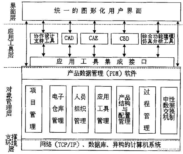 (3)对象管理层:利用PDM软件对产品开发过程的工作流和产品设计进行管理,通过建立项目管理、过程管理和任务调度机制对产品开发过程进行全面的控制。各种应用通过PDM的标准数据访问接口实现数据的访问,PDM的管理功能保证了数据的一致性、完整性和连续性。